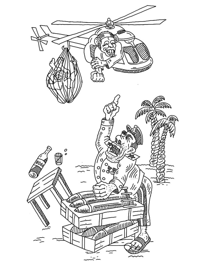 К моменту появления вертолёта с болтающимся в сетке Ициком, Ивану Федоровичу шел 87ой год. Но маршал, как всегда, был бодр и здоров. Исключение составляли дрожащая от негодования правая рука и потерянный в процессе обучения арабских артиллеристов глаз. Но Иван Федорович не обращал внимания на подобные пустяки. Главное — его «Катюши» времен Отечественной войны работали безотказно. Вдруг солдаты вокруг закричали, тыча пальцами в небо. «Что закудахтали, басурмане?» — по-отечески спросил Иван Федорович, задрал голову и увидел вертолет с голым Ициком, барахтающимся прямо над ним.