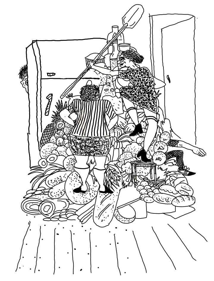 Эпопея закончилась, когда Вадя, выглянув в окно, увидел, как мамы, утирая пот со лба, толкали перед собой два вагона. Наперегонки они пытались довезти их до квартиры. 32 грузчика в течение 18 часов безостановочно разгружали еду в квартире Вади и Ицика. В результате Вадя был задвинут коробками в угол своей комнаты, а Ицик был заперт контейнерами в туалете. Мамы злобно посмотрели друг на друга и разъехались по домам.