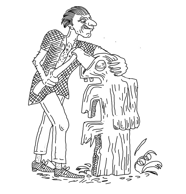 В течение двух последующих дней из комнаты Ицика раздавался стук топора. Вадя, зная способность Ицика обращаться с инструментами, ожидал дикого вопля и отрубленных членов. Но, к его удивлению, ждал он напрасно. Наоборот, через некоторое время из комнаты вышел торжествующий Ицик, обнимая большую деревянную болванку. Он поставил это бревно посреди гостиной. Когда Неучитель и Вадя разглядели творение рук Ицика, оба вскрикнули от ужаса. В окне напротив завыла собака.
